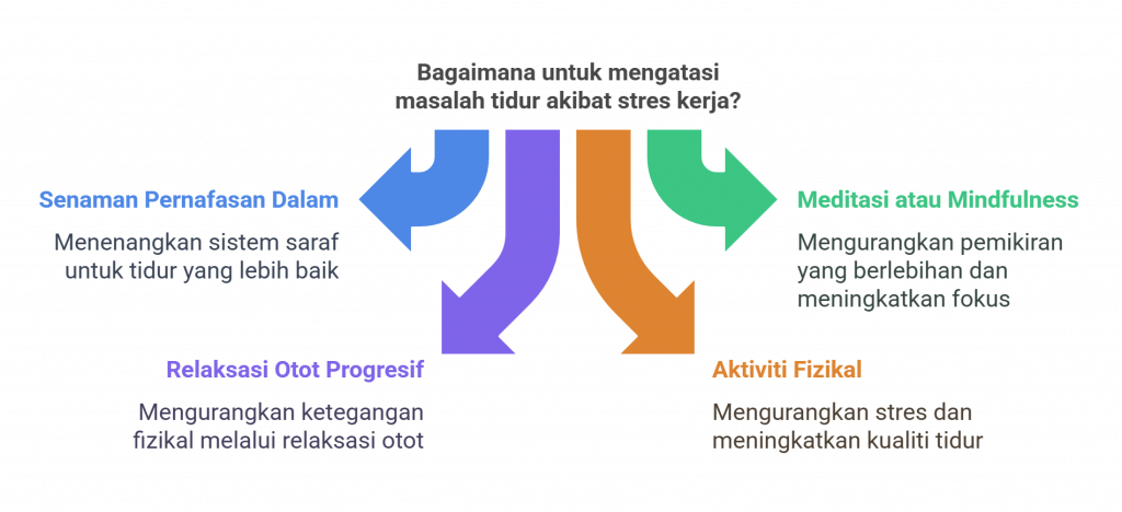 • Aktiviti Fizikal yang Teratur: Senaman membantu mengurangkan stres dan meningkatkan kualiti tidur. Namun, elakkan bersenam terlalu dekat dengan waktu tidur.
